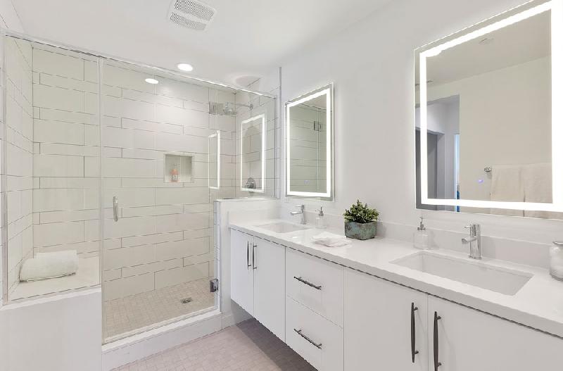 - Master bathroom with designer-selected 2” x 2” porcelain tile floor, frameless textured laminate cabinetry with matching cabinet pulls, vanity mirrors with integrated LED lighting, Quartz countertops and dual under-mounted rectangular sinks with Moen® plumbing fixtures