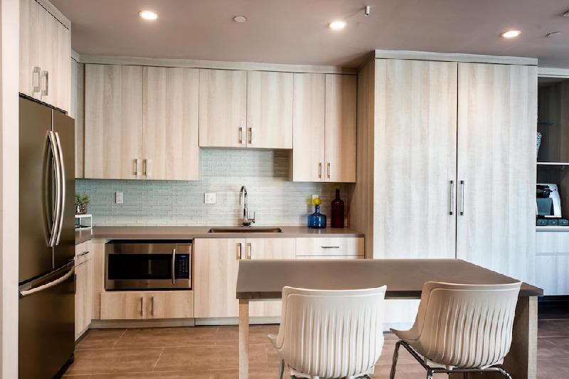- Exceptional Modern Kitchens with Quartz Counter-top featuring Contemporary Tile Backsplash, Custom Cabinets and MOEN Water features