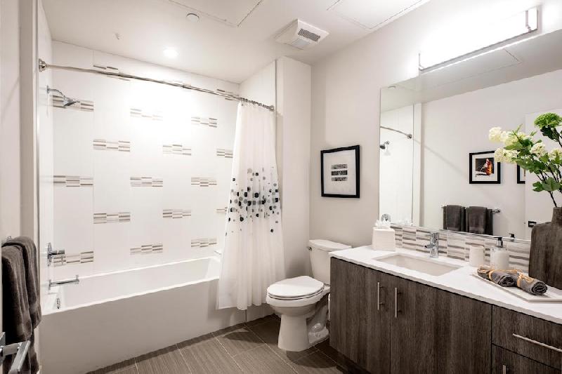 - Soothing Deep Soaking Tubs and Full Height Tile Showers accentuated with Custom Cabinetry and Quartz Countertop (Select Units)