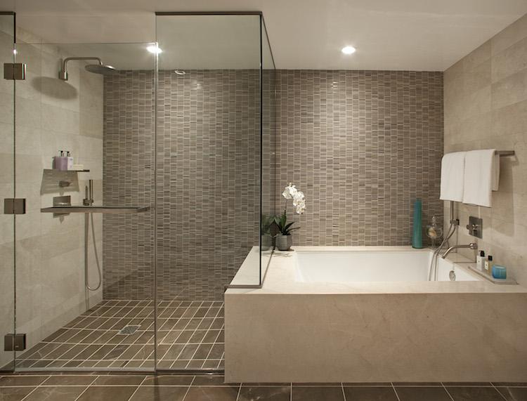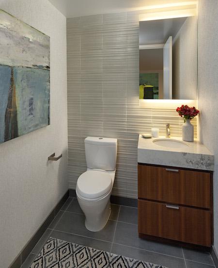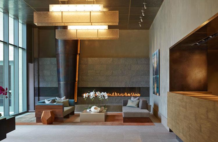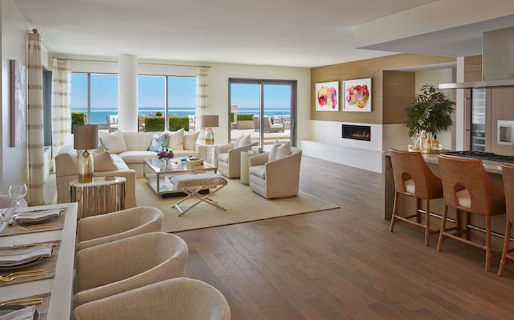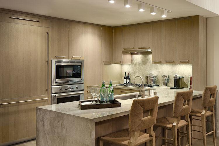 The Seychelle offers spacious living areas blending contemporary style with accents of polished quartzites, honed marbles and warm wood tones. The open gourmet kitchens feature polished Sea Pearl quartzite counters with a full-height backsplash, grey oak cabinetry, a Watermark single-lever faucet and appliances by Thermador. Spa like master baths with captivating details include Gaudi marble flooring, Crema Beige marble counters atop a chocolate oak vanity, and a Zuma bathtub and glass enclosed shower framed by a mosaic tile wall. Powder rooms include a custom teak vanity is finished with an Okite quartz counter, and graphite metallic tile flooring is accented by a Clodagh-designed feature wall with birch-colored Ann Sacks tile.