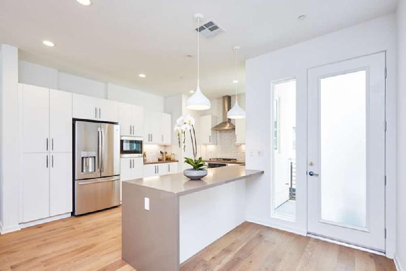 - Designer-selected pendant lighting over kitchen island