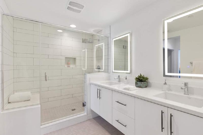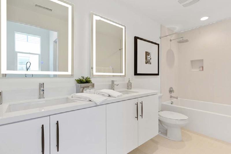 - Secondary baths with frameless textured laminate cabinetry with chrome pull, shower or tub/shower combination with full height 4” x 24” ceramic wall tile, Quartz countertops, vanity mirror with integrated LED lighting and Moen® plumbing fixtures