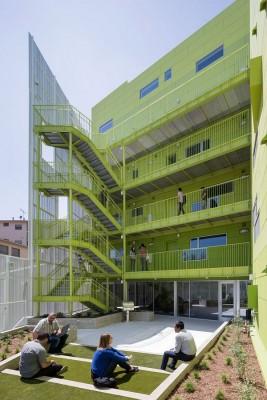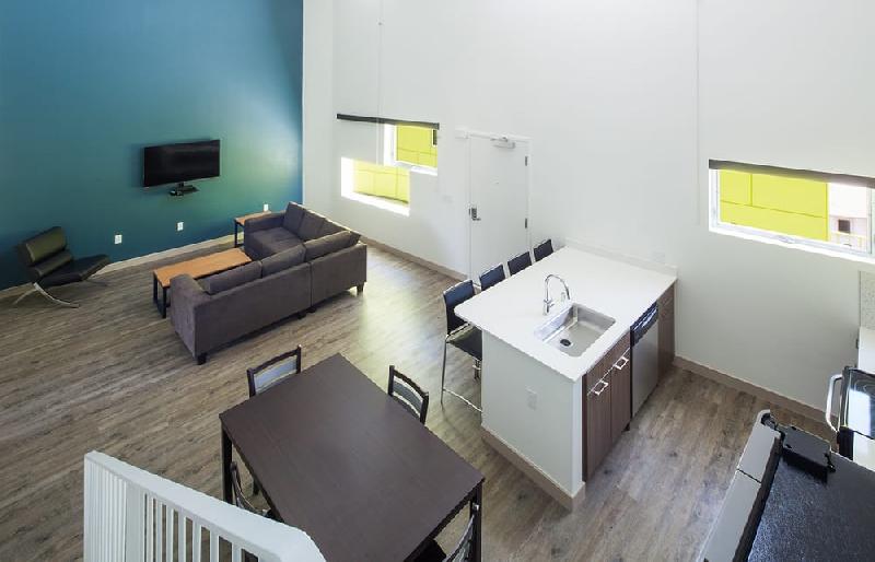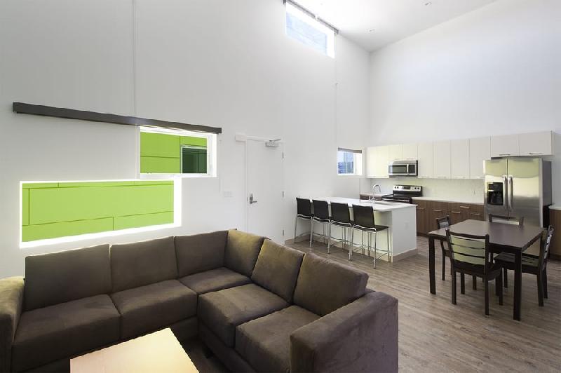 Continuing LOHA’s efforts to add green spaces into dense, urban developments, the building incorporates landscaped roof terraces at various levels, creating inviting outdoor areas for students. By stepping back the form, LOHA created access from each floor level to either a roof deck or a courtyard space, providing vital gathering and community-building venues. This continuous terracing of communal space from the street level to the roof results in a powerful urban and architectural gesture that offers a multi-layered connection both within the building and out towards the surrounding community.