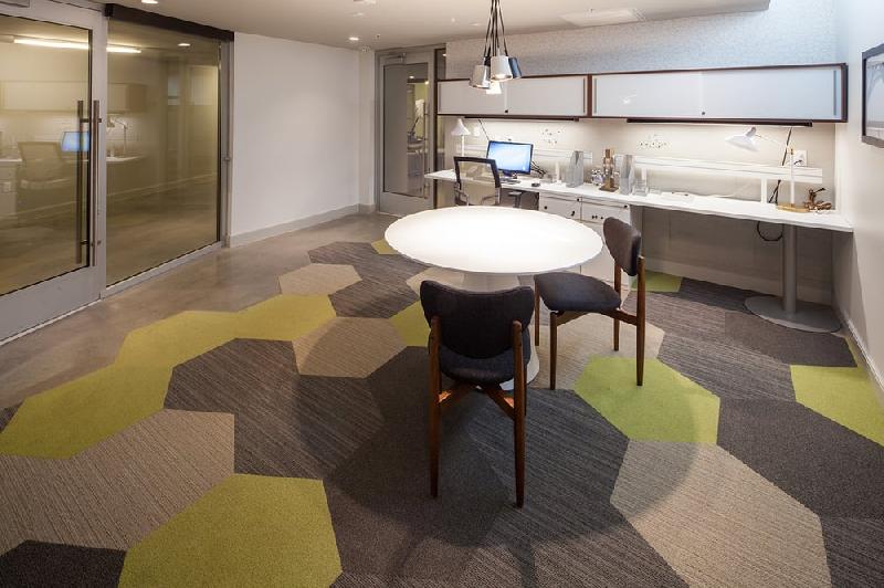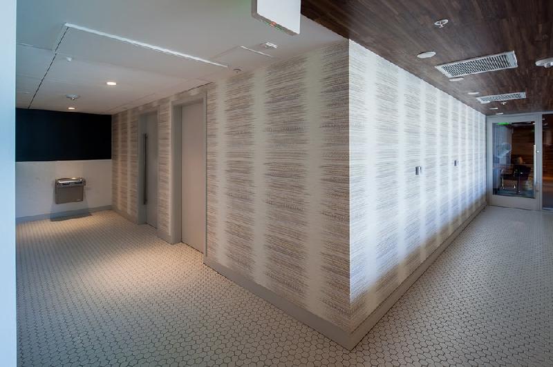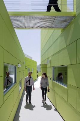 LOHA’s material choices for the building envelope of solid, perforated, and ribbed white metal panels project the vibrancy embedded within the project’s form, programming, and functions. Cement board painted in eight green-hued layers creates a gradient effect that grounds the building’s base and lightens as the structure meets the sky. The green delineates cuts in the building’s form, indicating voids for circulation and gathering spaces. The cladding system blurs the boundary between the sidewalk and the building mass, creating an animated effect of rippling shadow and light that breaks up the scale of the wall surfaces.