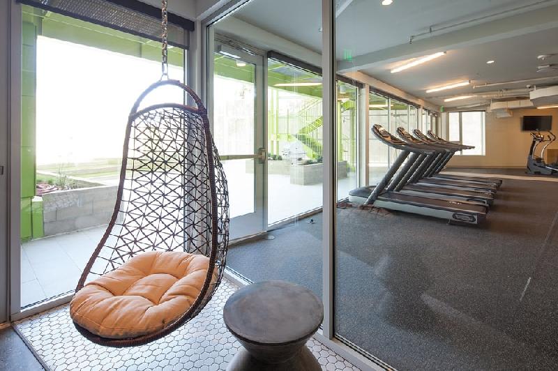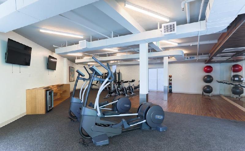 - Fitness facility with cardio equipment and yoga/aerobics studio