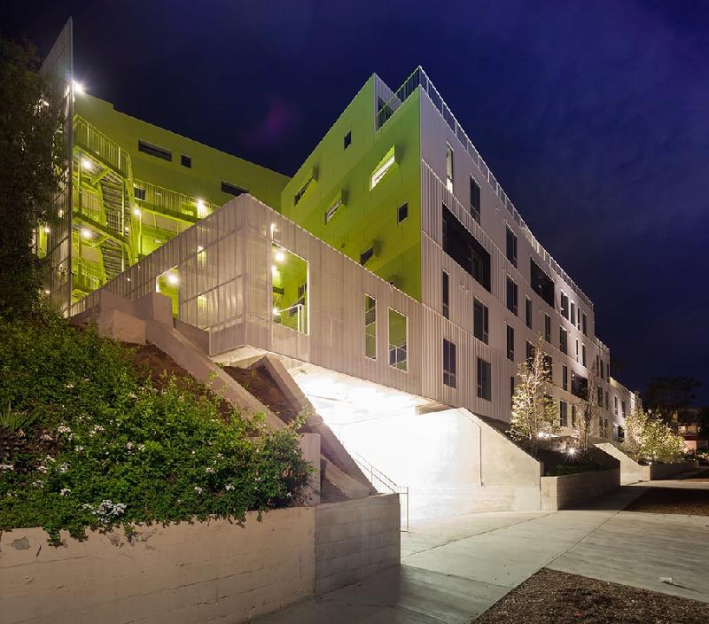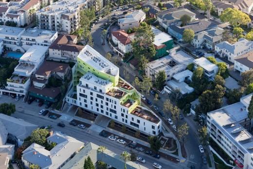 Sited opposite Richard Neutra’s Strathmore Apartments in the Westwood neighborhood of Los Angeles, this housing complex of 31 units and recreational amenities pays homage to its preeminent neighbor while providing the community with much-needed housing for students, faculty, and others on the border of UCLA’s campus. Following conversations with the client and community activists, LOHA developed a scheme that responds to the considerations of the established neighborhood, the client’s extensive program requirements, and the unique, wedge-shaped site.