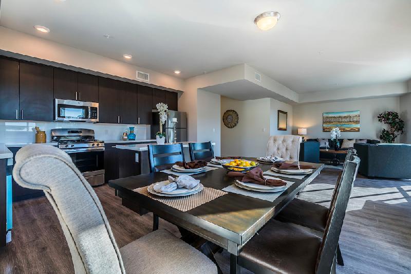 State of the art features include Nest wi-fi enabled thermostats and electric vehicle charging stations in the parking garage. Each unit has its own large balcony. Units also include open floor plans, high ceilings, carpet in the bedrooms, hardwood-vinyl plank flooring throughout living areas, large living/dining area, stacked washer/dryer and ample storage. The master bath includes tile tub surround and quartz counters. Kitchen includes quartz counters, garbage disposal, and stainless steel appliances including range, dishwasher, refrigerator, and microwave.
