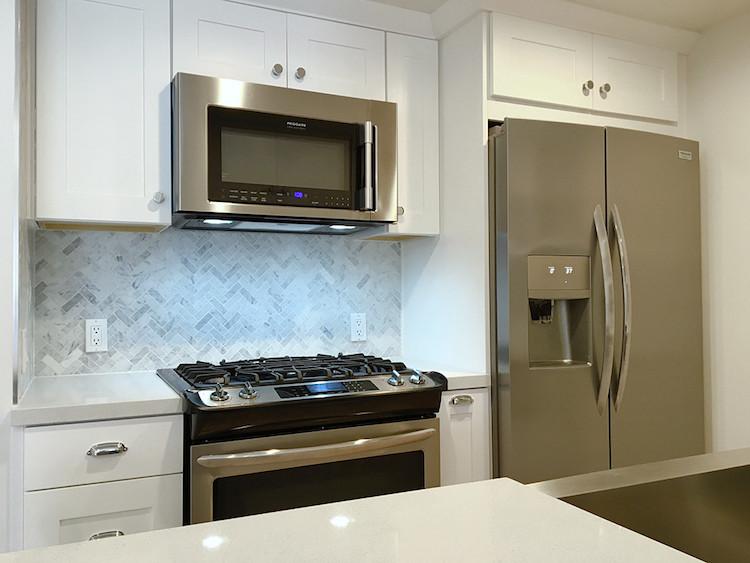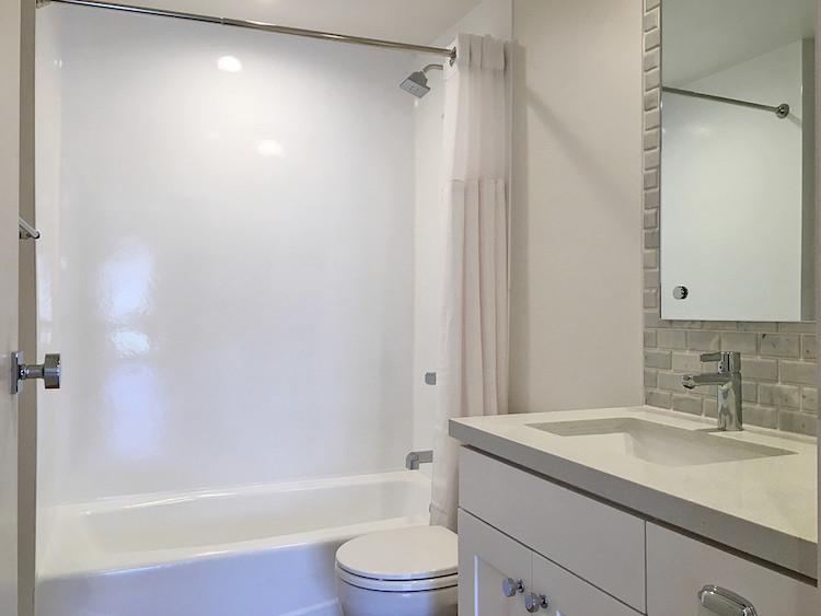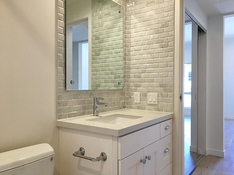 Interiors feature luxurious amenities including modern cabinetry, quartz countertops, designer backsplashes, hardwood laminate flooring, dynamite views (select units), fireplaces (select units), central A/C and heat with Nest Thermostat and large balconies.