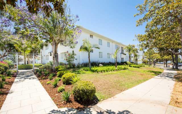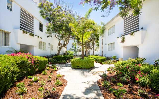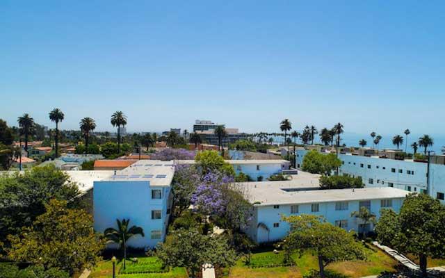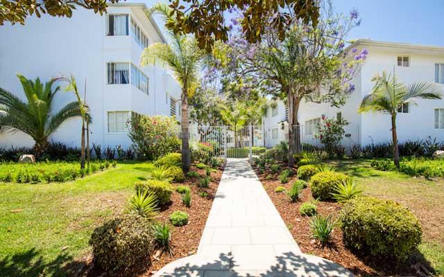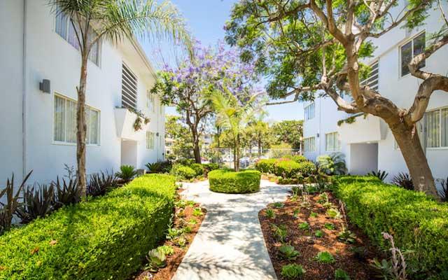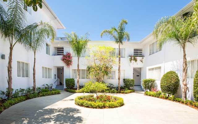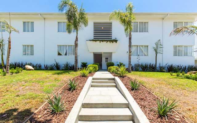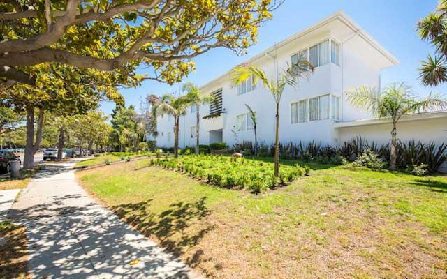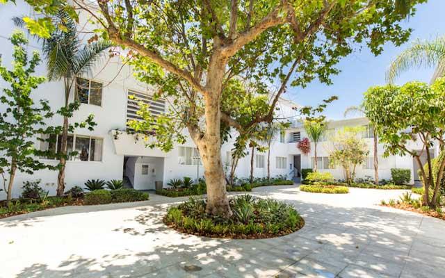 The Teriton Apartments were constructed in 1949 and designed by Sanford Kent AIA who had an established practice in Beverly Hills. This two and three story vernacular Modern style garden apartment complex is sheathed in stucco with its primary elevations either facing a landscaped center courtyard or north towards San Vicente Boulevard.