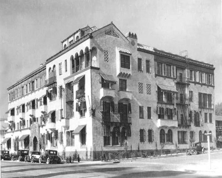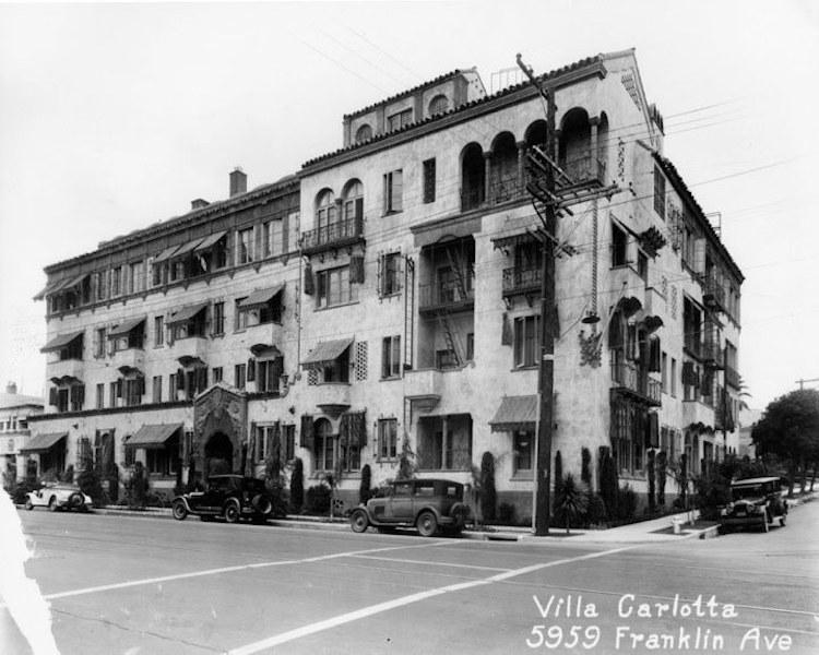 Villa Carlotta, built in 1926, is located in Franklin Village at the corner of Franklin and Tamarind avenues near the base of Beachwood Canyon. This Spanish colonial building originally belonged to Eleanor Ince, widow of silent-film tycoon Thomas Ince. Its architect, Arthur E. Harvey, also designed the neighboring Chateau Elysee, now Scientology's Celebrity Centre. In 1924, Thomas Ince died a few days after being carried off William Randolph Hearst's yacht, and rumors swirled that Hearst had shot him by accident, a bullet intended for Charlie Chaplin, whom the mogul suspected of having an affair with his mistress, Marion Davies. Hearst allegedly financed the building's construction as a grief payment to Eleanor. In later decades, Villa Carlotta became a favorite haunt for rock bohemians like Jim Morrison.