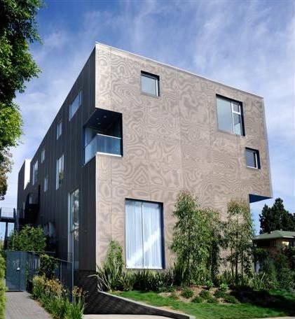 The façade’s cutouts create a visual tunneling effect into the units and the street level similarly heightens community engagement. Entrances to the units abut the sidewalk, a rarity in the Los Angeles area. The building’s skin of stainless steel mesh, mounted on a custom bracket system, produces a dynamic and engaging moiré pattern. The material, which facilitates the growth of vines, welcomes the landscape onto the building itself.