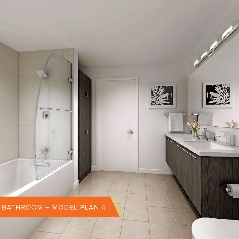 - Tub/shower combination with frameless, radius corner shower door at master baths