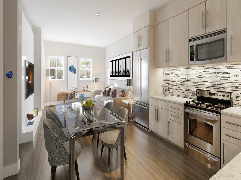 Each apartment features expressive design with exceptionally modern kitchens highlighting upscale, quartz countertops, tile backsplash, and complementing custom cabinetry. Bathrooms feature soothing soaking tubs and full height tile showers, while each apartment is outfitted with Nest thermostats and hi-tech washer and dryer units.