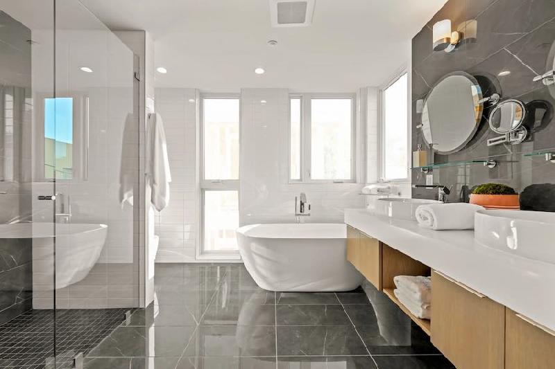 These modern homes offer 3 bedrooms and 3.5 bathrooms, designed with both style and energy efficiency in mind. The kitchens are equipped with Bosch stainless steel appliances, quartz countertops, and an oversized island. Energy-saving features include tri-zone HVAC, two tankless water heaters, and pre-wiring for electric vehicle chargers: high ceilings, dual-pane windows, and engineered wood flooring for durability. The primary suite occupies its level and includes a luxurious bathroom with a separate shower and soaking tub. Each residence also provides two parking spaces, a private storage room, and a rooftop deck.