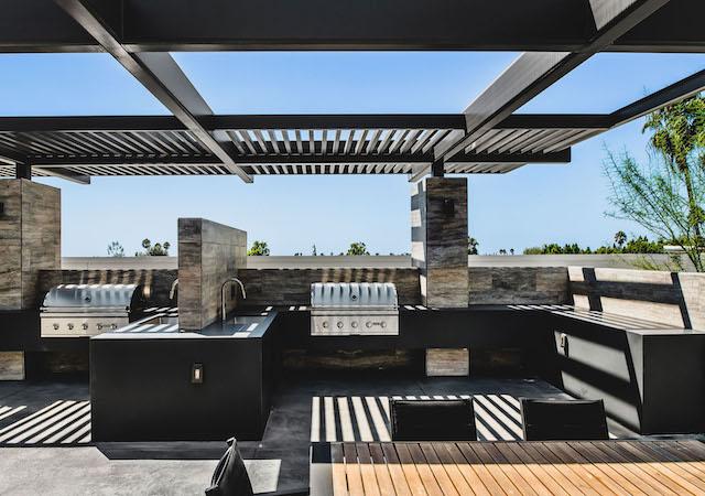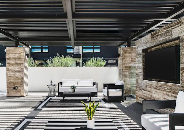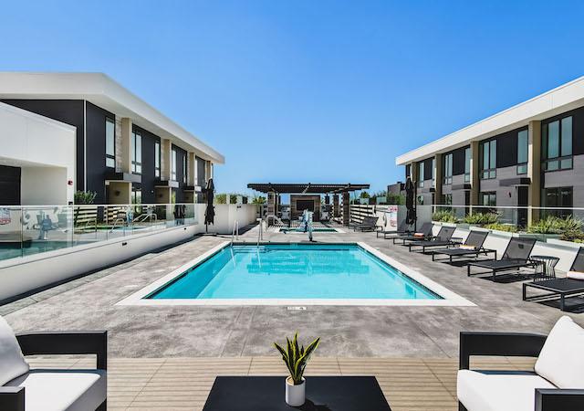 The building’s façade and Level Five Amenity Deck exterior feature travertine stone cladding, known for its durability and versatility in modern architecture. The design is enhanced with glass and metal railings, a striking pergola, and clean, modern lines, creating a sophisticated and timeless look.