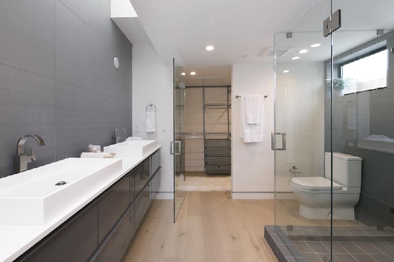- Bathrooms en suite with floating dual sink vanity and glass enclosed shower with rainfall showerhead