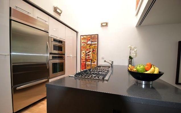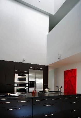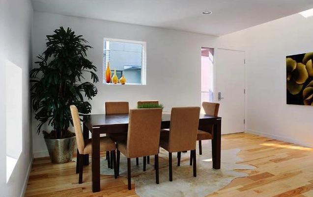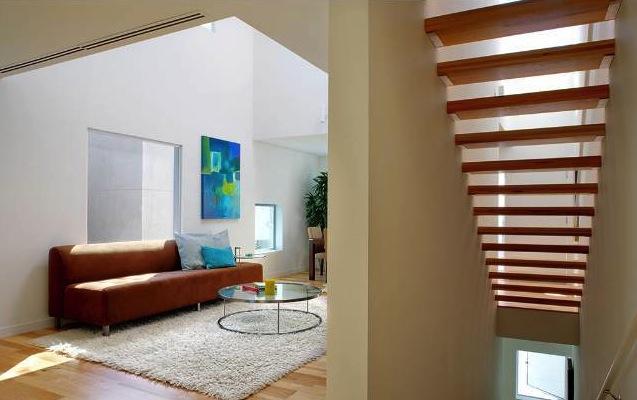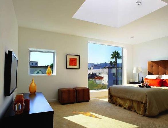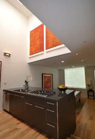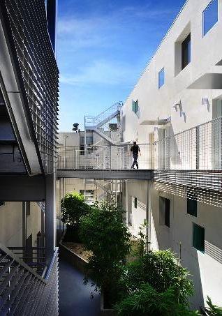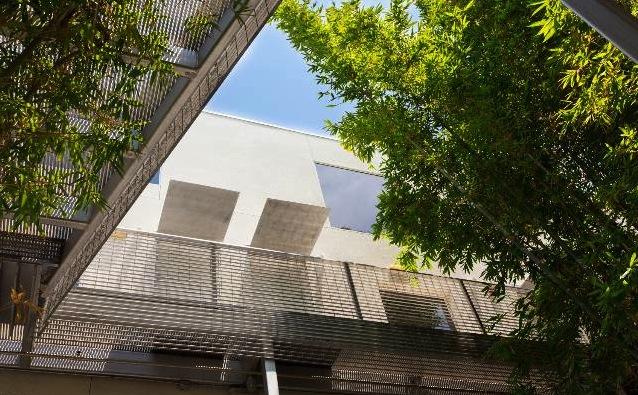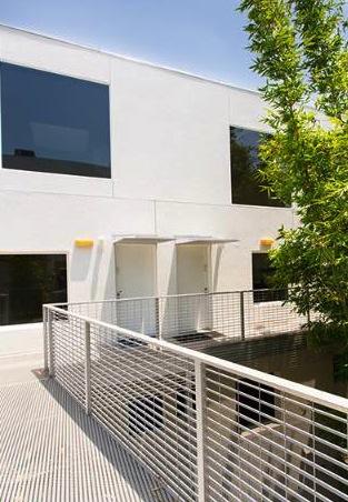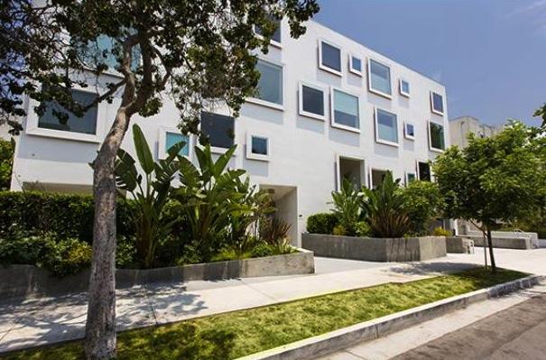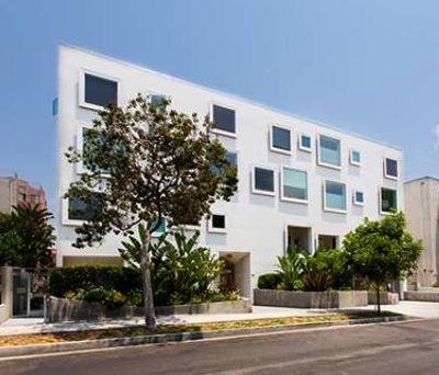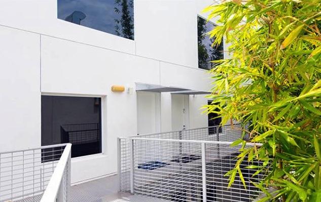 Inside fifteen two-bedroom homes of two and three levels lie within two parallel, elongated blocks separated by an interior court of trees and a 40' green privacy wall. The blocks connect via steel pedestrian bridges. Some units have 2-story spaces with 9-18' ceilings and views of the Hollywood Hills.