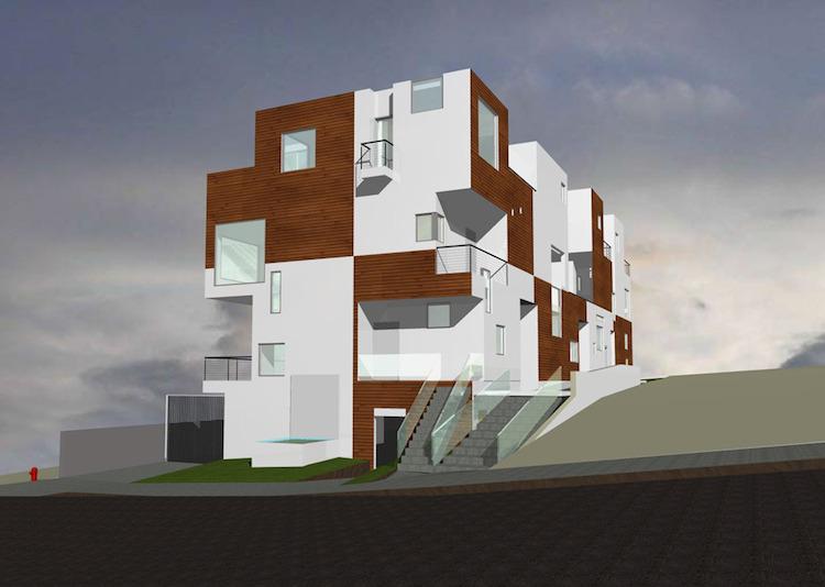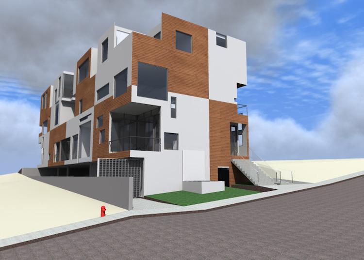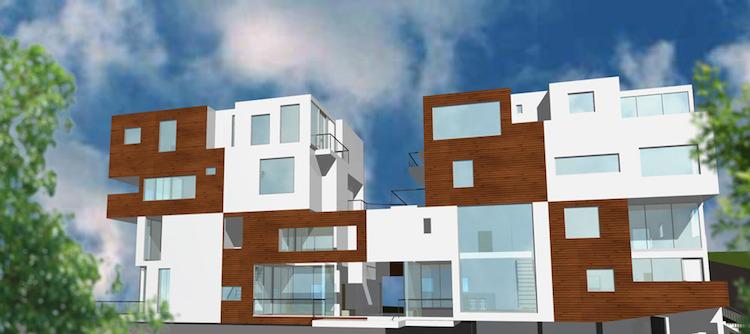 Each of these eight condominiums will be on two stories, allowing for double height spaces in the public areas. The top four units have private roof decks and the lower units each have access to a private deck or interior garden. Finishes will include bamboo flooring, recycled glass counters, FSC certified wood cabinets, no VOC paint, eco carpet. To reflect the interior divisions, the south elevation takes the basic eight blocks and creates variations within the wood-and-stucco with windows, decks and cut-outs. On the north side, a series of screens provide privacy from neighboring buildings.