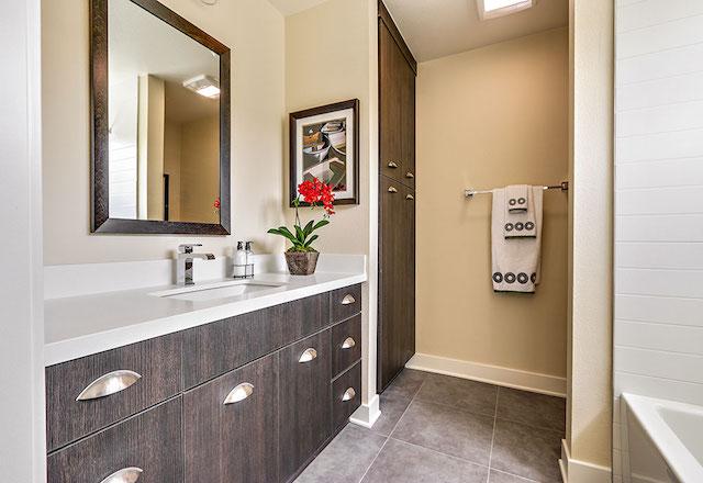 - Quartz bath vanity finished with undermount sink, mitered edge and 4 inch backsplash