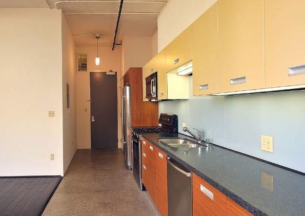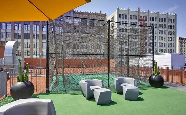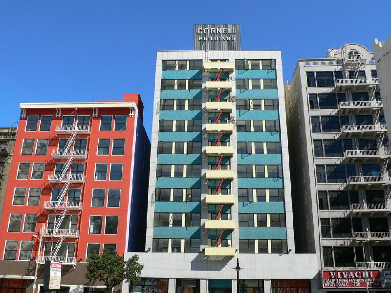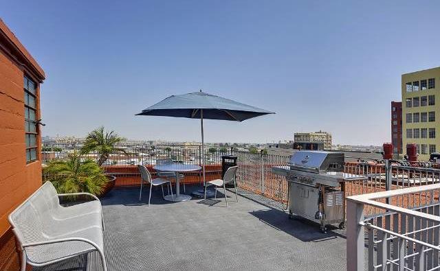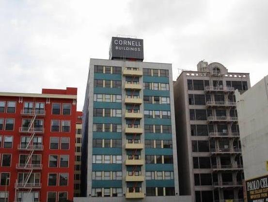 The Connell's facade features triplicate sets of steel-framed windows and a connecting bridge to The Santee Building.