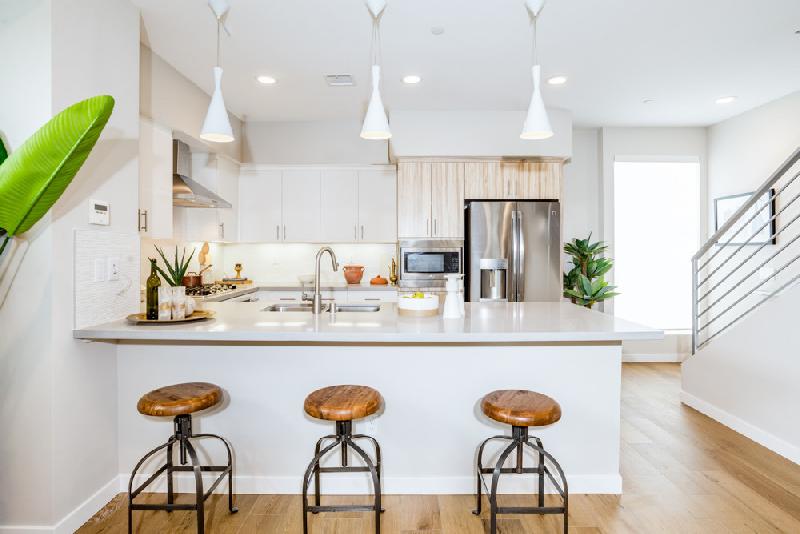 - Designer-selected light fixtures over kitchen island and in bathrooms