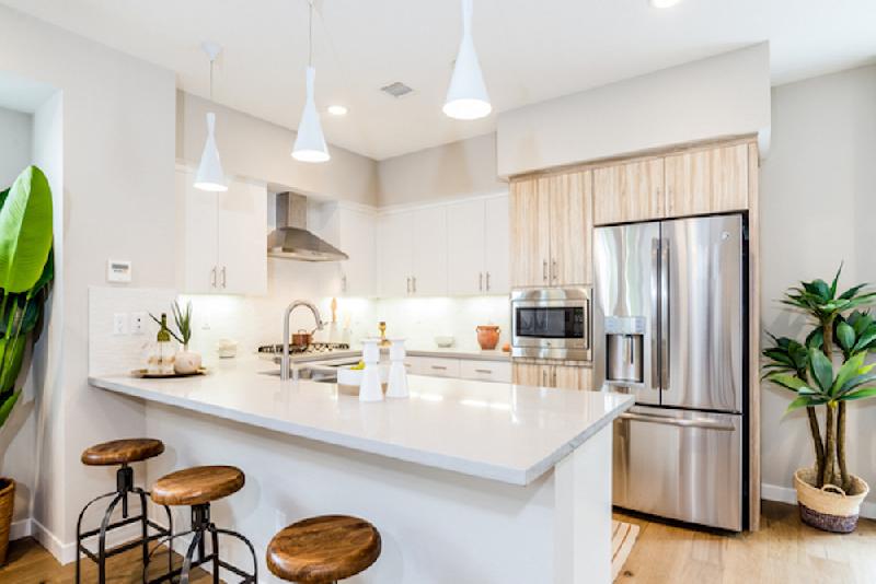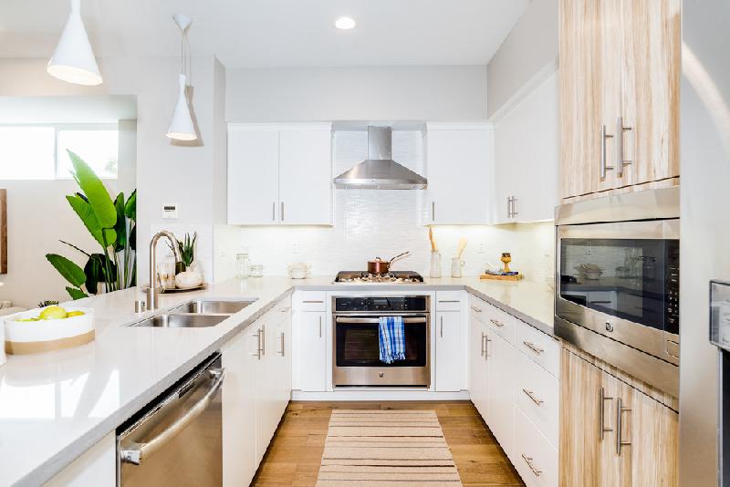 - Quartz slab countertops with 8” x 13” Porcelanosa tile backsplash and stainless steel under mount dual compartment sink with Moen® brushed nickel pullout faucet
